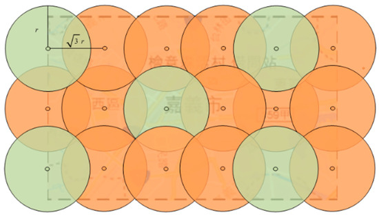 Finding the MDS in a UDG has been extensively studied in the past and it has been proved that this problem is a NP-hard problem [16]. Due to the large number of nodes in this research, the previous proposed algorithm [17] is not suitable for this study. Because the number of nodes in this study is too large, it is too time-consuming to find the MDS. Therefore, in this study, we use a linear algorithm provided by the previous literature [18]. The linear algorithm repeatedly selects a random point from the undirected graph and adds the selected point to the dominating set, and removes all the nodes that have been covered from the remaining node set, the repetition ends when no node is remained. In this study, the discs with radius r is used to cover the area and the distance between two nearby discs is set to . Figure 5 shows the concept of the unit disc coverage. The linear algorithm [18] is used to find the dominating set. The reason of finding the dominating set is because there is less likely to have the same area of coverage when searching the area. The set of green discs in Figure 5 is a dominating set and can be used as the starting point for the subsequent search.