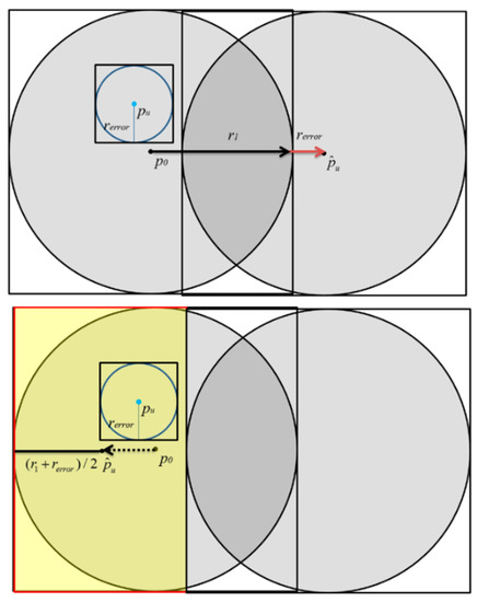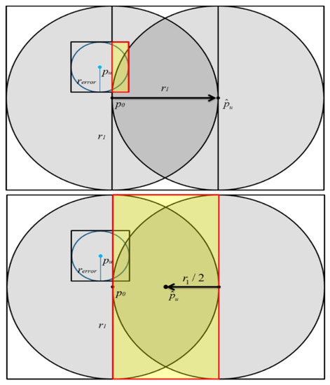 As shown in Figure 7, due to the influence of rerror, previous proposed space partition attack algorithms might incorrectly assume that the real location of the target user pu is inside the disc centered at . The yellow area in Figure 7 is the intersection of the rerror disc and the disc. Therefore, it is impossible to accurately infer the true location of the target user in the inference process. Although the distance fuzzy is adopted by GSNs, as long as this fuzzy error rerror is taken into account, there is still a great chance to locate the target user’s real location. Actually, the fuzzy error rerror does exist in the real environment. In the past there have been a lot of research on the spatial cloaking technology, so the previous results show that the cloaking area can be obtained using statistical methods. Therefore, the algorithm proposed in this research first adds rerror to or subtracts rerror from the original moving distance r1, as shown in Figure 8. Therefore, the distance mistake can be avoid, and the exact location of the pu can be correctly inferred, as shown in Figure 8.