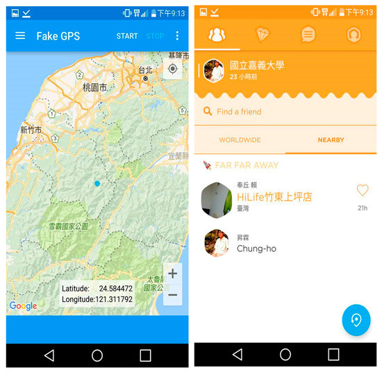 This research selected Swarm6.3.8.65 to carry out the experiment (Figure 9 right), mainly using mobile phones with Android operating system version 5.0 or above. In order to facilitate the experiment, this study adopted Fake GPS App 1.5.3 (Figure 9 left) for location forgery. In addition, the positioning error is used to compare different algorithms. The positioning error is the distance between the estimated position and the real position pu.