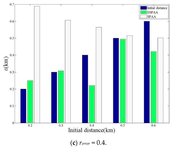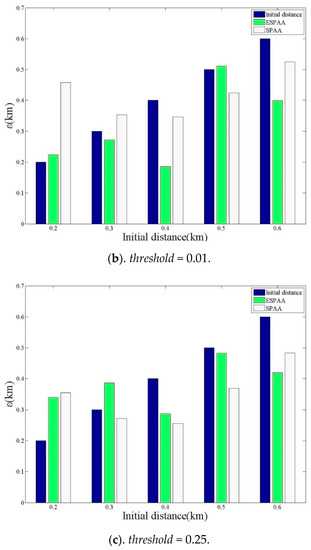 The threshold will affect the number of searches in the algorithms, and then further affect the final positioning results. The coefficients of the experiment are set as follows: rerror = 0.2(m) and r1 = 0.5(m). The following experiments were conducted with three different thresholds, threshold = 0.25 km, threshold = 0.01 km and threshold = 0.001 km. As Figure 11 shows, it can be found that when threshold becomes larger, the positioning errors of both SPAA and ESPAA are significantly reduced. This is because threshold can affect the number of searches. When given a smaller threshold, the positioning error of the ESPAA is smaller than SPAA, thus showing the effectiveness of the proposed ESPAA. The results of threshold = 0.01 and threshold = 0.001 did not show much improvement, so the attack algorithm still has its limit. In sum, if the threshold can be set properly, the best positioning effect can be achieved with the least number of searches.