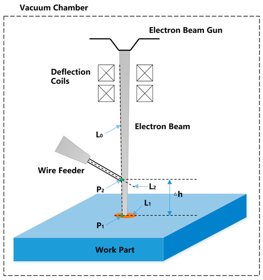 The instability of the droplet transfer will, however, cause the quality of the electron-beam freeform fabrication to worsen or even cause the interruption of the deposition process [5,6,7]. It is urgent to realize the closed-loop control of the droplet transfer, which will make the deposition process stable in the liquid bridge transfer state, but the rough surface of the deposited layer will cause instability of the droplet transfer [8,9,10,11,12]. Geometric errors occur because of the instability of the heat input and change in the thermal diffusion conditions. The surface of the deposition layer will become obviously uneven after layer-by-layer accumulation, even if the geometric error is very small in each layer. The height of the wire feeder is usually fixed during the EBF3, so when the surface of the deposited layer is higher than the target surface, the droplet transfer distance decreases, and the wire and substrate become easier to adhere to one another, resulting in the interruption of the deposition process. Further, when the surface of the deposited layer is concave, the droplet transfer distance increases, which results in a large droplet at this time and seriously affects the forming quality [5]. In order to ensure the deposition quality, it is urgent to control the droplet transfer distance in real time so that the deposition process is stable in the transfer state of the liquid bridge. In order for electron-beam freeform fabrication technology to be applied in the environment of space, a stable liquid bridge transfer must also be realized. When deposited on Earth, the droplets are still able to transfer by gravity. In the environment of space, however, weightlessness makes it impossible to rely on gravity for droplet transfer—only surface tension can be relied on for droplet transfer [13]. This requires the deposition process to maintain a very stable liquid bridge transfer.
