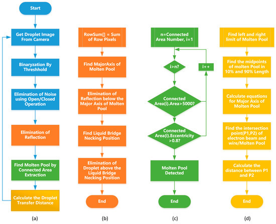 Flowchart of image processing: (a) main program of image processing algorithm; (b) subroutine for image segmentation; (c) subroutine for molten-pool extraction; (d) subroutine for calculation of droplet transfer distance.