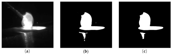 The droplet transfer image is captured by an industrial camera, as shown in Figure 4a. Firstly, the original image is binarized on a preset threshold to facilitate the extraction of the molten pool. The binarized droplet transfer image is shown in Figure 4b. It can be seen from Figure 4b that after being binarized, some miscellaneous points and solidification areas around the lower grey value have been eliminated. There are still some high-level noise points in the figure due to spatter and reflection. The image is first eroded and then dilated by a square connected domain with a size of 20. The droplet transfer image after erosion/dilatation is shown in Figure 4c. As we can see from the figure, the spatter and small reflection area can be eliminated.
