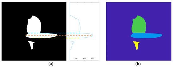 The preprocessed images are divided into two regions: the droplet and the molten pool overlapping regions and the reflection regions. In order to accurately calculate the long axis of the molten pool, it is necessary to segment the image and accurately separate the droplet, the molten pool and reflection area. The flow chart is shown in Figure 3b,c. The image is accumulated along the row according to Equation (1), and the pixel accumulation distribution curve (Yi) along the image row is obtained, as shown in Figure 5a. First, the maximum peak point of the whole curve is found, and the row index (imax) of this point is regarded as the height value at the maximum length of the molten pool. Then, it is necessary to find the local minimum point of the curve (Yi) from i = (imax -200) to i = imax. The row index (idroplet) of this point is considered the height of the horizontal boundary between the molten pool and the droplet. Afterward, it is necessary to find the local minimum point of the curve (Yi) from i = imax to i = (imax +200). The row index (ireflection) of this point is considered the height of the horizontal boundary between the molten pool and reflection. The segmented image is shown in Figure 5b. The aspect ratio and center of the smallest external rectangle of each region are then calculated, respectively. In the connected domain where the aspect ratio is greater than 4 and the pixel area is greater than 5000, the closest connected domain to the height at the maximum length of the molten pool is considered as the molten pool.