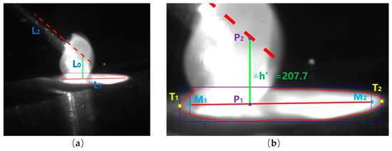 After obtaining the molten pool area, it is necessary to extract the long axis L1 of the molten pool in Figure 6a, whose flow chart is shown in Figure 3d. The left and right limit points T1 and T2 of the molten pool are first extracted, as shown in Figure 6b. To avoid unnecessary fluctuation of the molten pool majoraxis detection caused by the drift of the marginal point, the left and right limit points are moved to 10% of the maximum molten pool length inside the molten pool. After that, the midpoint M1 and M2 of the upper and lower points of the pool profile is calculated at this horizontal position. The line of M1 and M2 was used as the molten pool long axis L1. Because the position of the wire and electron beam is fixed, the position of them is calibrated in advance of the experiment. Taking the intersection point P1 of L1 and L0, and the intersection point P2 of L2 and L0, the pixel distance of P1 and P2 is calculated as △h’, denoting the droplet transfer distance in pixels.