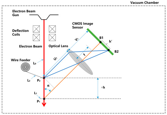 The camera should be calibrated to calculate the distance of the droplet transfer △h in millimeters from the distance △h’ in pixels. The principle of calibration is shown in Figure 7. After the electron beam is emitted from the cathode of the electron gun, it is vertically incident on the substrate surface, intersecting with the deposition surface at point P1, and intersecting with the wire at point P2. P1 passes through the lens and focuses on point B1 of the CMOS chip. The real distance of the droplet transfer is defined as △h, and the pixel distance of the droplet transfer is defined as △h'. The angle between the electron beam and the imaging light axis is defined as α. The focal length of lens is f. The object distance is and the image distance is . The corresponding relation between the pixel distance △h’ of the droplet transfer and the real distance △h of the droplet transfer can then be obtained by geometric calculation:
