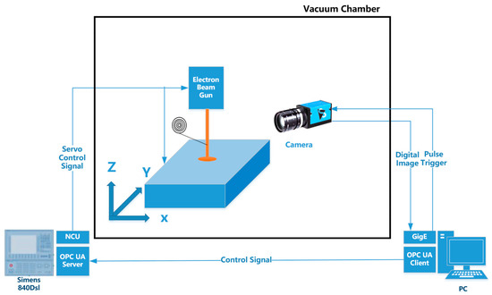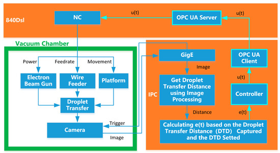 The flowchart of the entire system is shown in Figure 10. The electronic gun and the motion platform are controlled by the Siemens 840Dsl numerical control system. The electron beam is accelerated by a high-voltage electric field to melt the wire and substrate to form a droplet transfer. At this point, the IPC generates a signal that triggers the camera to capture the droplet transfer image. The image collected by the camera is transmitted to the industrial control computer through the Gig-e port. The droplet transfer pixel distance is obtained by the image processing program. The real distance of the droplet transfer is calculated according to Equation (2) in the previous section. The droplet transfer distance deviation e is calculated and sent to the controller. The output value of the controller is transmitted to the 840dsl NC system through the OPCUA communication. Then, the height of the platform is adjusted in real time to make the droplet transfer distance stable.
