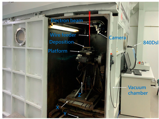 In recent years, the technology of metal additive manufacturing has been developed rapidly, attracting the attention of many researchers. There are many ways to additively manufacture metals, including Electron Beam Melting (EBM), Selective Laser Melting (SLM), Direct Metal Laser Sintering (DMLS), Hot Wire Gas Tungsten Arc Welding (HW-GTAW), and Ion Fusion Formation (IFF). The most remarkable feature of additive manufacturing is that a product is made layer-by-layer without mold or tooling. The computer aided design (CAD) model is divided into layers of consistent thickness by slicing software. Only one layer is deposited at a time, and the layers are stacked layer-by-layer to form the final part [1,2]. Electron-Beam Freeform Fabrication (EBF3) is one of the metal additive manufacturing technologies. The processed parts can reach the strength of forgings. Compared with other metal additive manufacturing methods, EBF3 can achieve a higher deposition efficiency with quality assurance because the vacuum environment is beneficial to the protection of parts [3,4].