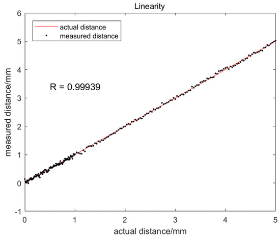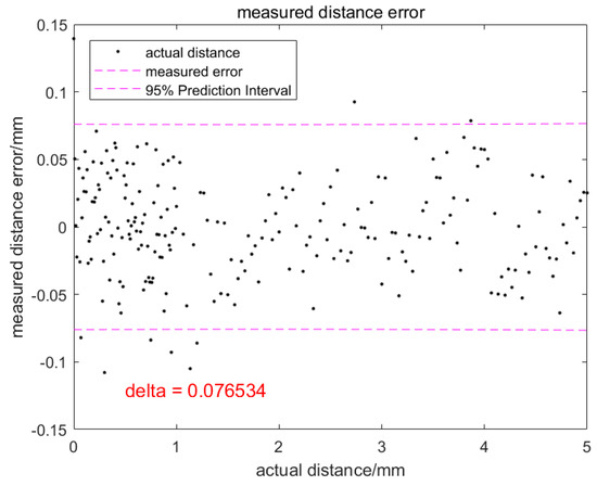 For the open-loop experiment described in Table 1, the droplet transfer distance is detected by the image processing algorithm. Figure 11 shows the detected droplet transfer distance versus the actual droplet transfer distance. It can be seen from the figure that the linearity of the detection method is very high and the correlation coefficient reaches up to 0.99. Figure 12 is the measurement error versus the actual droplet transfer distance. Ninety-five percent of the points fall within ± 0.08 mm around the actual droplet transfer distance. The maximum error is 0.14 mm, which meets the demand of the closed-loop control of droplet transfer.