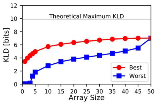 Figure 4 shows the best and worst KLD values of the arrays by size. Only arrays of size 1−5 were done using the brute force method; all other array sizes were screened via the genetic algorithm, hence the best, worst, and average KLD is that of all the screened arrays, not of all possible arrays.