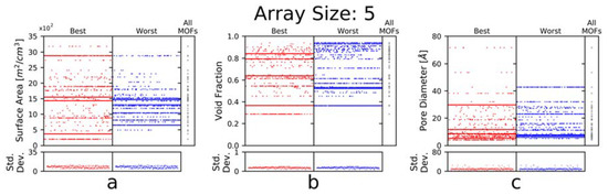 When considering the data shown in Figure 5 and Figure 6, it is important to remember that there are only 50 MOFs to choose from, and the gas mixtures feature only three gases of similar sizes (kinetic diameter of CO2 is 3.30 Å, of O2 is 3.46 Å, and of N2 is 3.64 Å) [50]. As such, the selected MOFs may not be representative of the whole material class (though they were chosen to be relatively diverse) and the gases are clearly not representative of gases species at large. Thus, the conclusions from the above figures may not be applicable for all gas-sensing applications, but rather specific to detecting CO2 in air. Moreover, with CO2 being strongly polar (relative to N2 and O2) and more likely to exhibit strong binding relative to these gases, it is plausible that other features, such as open metal sites, have a greater influence on the adsorption behavior, and thus are better predictors of and design criteria for the best/worst arrays than the features examined here [51,52,53]. Nevertheless, our study and the methodology described herein can help guide our intuition with regards to the importance of these features for gas sensing.