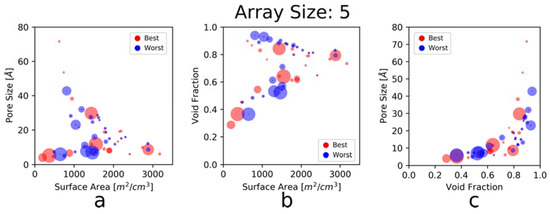 Physical property coupling (top/bottom 300 arrays), where (a) examines the relationship between pore size and surface area, (b) examines the relationship between void fraction and surface area, and (c) examines the relationship between pore size and void fraction. Dot color corresponds to elements of the best/worst arrays (red is for best arrays, blue for worst arrays) and dot size corresponds to the number of times the element is featured in the best/worst arrays (a larger dot corresponds to being present in more arrays). This is the same set of arrays used in Figure 5.