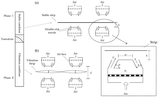 The experimental device adopted a double slot nozzle. In Figure 1, Pj is the pressure in the air box, Vj is the impinging air velocity of the nozzle, w is the distance between the two slot nozzles, b is the width of a single slot nozzle, h is the floating height of the strip expressing the distance between the lower surface of the strip and the upper boundary of the lower nozzle, θ is impinging angle of the slot nozzle, and d is the distance between the upper nozzle and the lower nozzle.