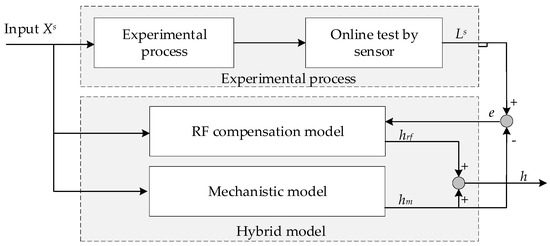 First, some data pairs containing the height label were collected on the self-developed experimental platform (Air cushion furnace experimental platform, Northeastern University, Shenyang, Liaoning Province, China). In the structure shown in Figure 3, the hybrid model has two parts: the mechanistic model and the RF compensation model. On the one hand, data set is input into the mechanistic model, and this can predict main process information. The predicted value hm generated by the mechanistic model and the actual height L will have a certain deviation caused by partially unmodeled information, which is termed as error e. The error data can be obtained. On the other hand, the RF compensation model is trained on error data . The obtained output value hrf of the RF can compensate for the difference between the actual value and the output of the mechanistic model [38]. Finally, the compensation value hrf is added to the predicted value hm to obtain the strip floating height h in the stable state. The hybrid model not only considers the thick jet theory and the force equilibrium equation, but also takes full advantage of the information in the data. Further, the model compensates for uncertainties that arise from the inherent process complexity.