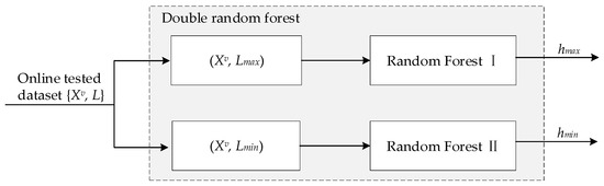 In the vibration state, the surface quality will not be affected when the highest and lowest points of the floating strip have no contact with the nozzles. Therefore, the peak values could be the key variable of prediction [39,40]. An effective method to assure the surface quality is to construct a model to predict the maximum and minimum floating heights of the strip in the vibration state and controlling the process parameters to ensure the floating height is within a reasonable range. In this part, a double random forest model is proposed to predict the maximum and minimum floating height in the vibration state. The schematic of the prediction model is shown in Figure 4.