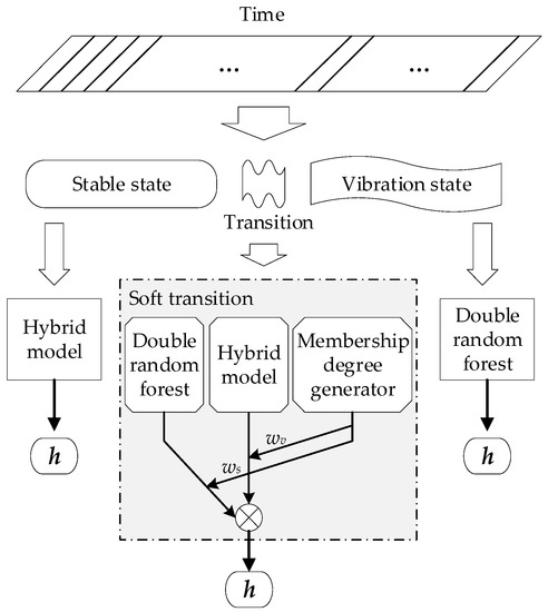 As is mentioned above, a parallel hybrid model for the stable state and double random forest model for the vibration state were established. Additionally, there is an intermediate state between the two states, that is, the transition. In the transition stage, the floating process of the strip shows dynamic characteristics of crossing and gradual change with the two neighboring states. The two nearest-neighbor states refer to the stable and vibration states connecting with the transition head and tail. In fact, a single stable prediction model or vibration prediction model cannot accurately describe such a crossing and gradually changing dynamic characteristics [41]. In order to predict the height of strip floating in the transition state, a novel soft-transition modeling method is proposed in this paper.
