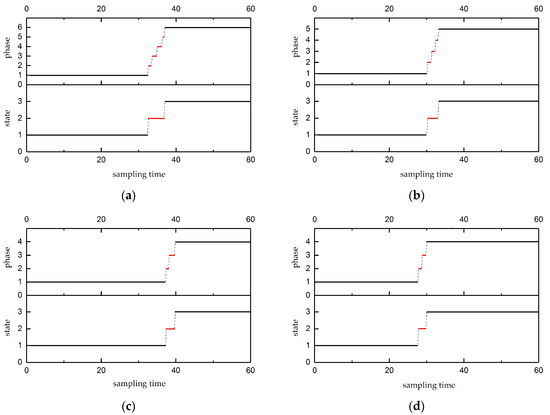 In Figure 8, because of the dynamic characteristics of the transition state, the transition state (indicated with red lines) was divided into several phases during the running process of the algorithm, as shown in top of Figure 8a–d. These phases were finally identified as three floating states using a subsequent algorithm, as shown in the bottom of Figure 8a–d, where states 1–3 represent the stable state, transition state, and vibration state, respectively.