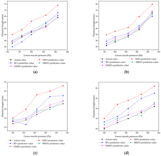 The prediction and actual floating height in the stable state: (a) thickness = 1.5 mm, upper pressure = 40 Pa; (b) thickness = 1.5 mm, upper pressure = 90 Pa; (c) thickness = 2 mm, upper pressure = 40 Pa; and (d) thickness = 2 mm, upper pressure = 90 Pa. RF: Random forest, HMSS: Hybrid model for stable state, MM: mechanistic model, SBEH: Hybrid selective bagging ensemble model.