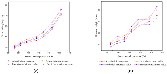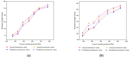 The proposed soft-transition method was tested on strips with 1.5 mm and 2 mm thicknesses. During the floating process of the 1.5 mm strip, when the upper nozzle pressure was fixed to 0, 5, 10, 60, 80, 90, 120, 160, 200, 260, 310, and 430 Pa in turn, the lower nozzle pressure increased gradually from 40 Pa. Furthermore, the transition data was collected under 12 experimental conditions. During the floating process of the 2 mm strip, when the upper nozzle pressure was fixed to 5, 10, 40, 60, 80, 90, and 120 Pa in turn, the lower nozzle pressure increased gradually from 40 Pa. Furthermore, the transition data was collected under seven experimental conditions. The contrast among the prediction maximum value, the prediction minimum value, and the actual height are shown in Figure 11.