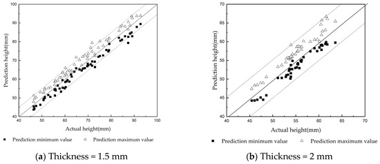 For expedient understanding, the statistical results are shown in Table 4, which list the hit rate of the actual height greater than prediction minimum value, as well as less than the prediction maximum value. That is, the ratio of the number of sample points whose actual height was between predicted maximum value and the predicted minimum value to the total number of sample points is called the qualitative hit rate. The ratio of the number of sample points whose predicted maximum value and predicted minimum value were within a distance of ±5 mm at the true height to the total number of sample points is called the quantitative hit rate. The qualitative hit rate reflects the effectiveness and accuracy of the prediction of the maximum value and minimum value. The quantitative hit rate can provide a more accurate range and referential value for the prediction of the strip floating height.