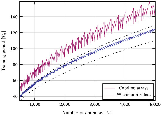 In the case of Wichmann rulers, it is not possible to obtain them for arbitrary lengths, but instead a length close to a given value. Hence, to obtain a ruler close to length , the r parameter can be found as the largest such that , which is . The other parameter is the largest such that , implying that . The length of the ruler can be completed up to by the method detailed in the previous section. Since the Wichmann rulers always contain entries from 0 to r, and the s parameter increases length in steps of , this completion procedure will add always at most marks to the ruler, and the minimum training period will be in the interval . Figure 1 shows the training length obtained with this strategy compared to the upper and lower bounds in (12). It also shows the length achieved with the coprime arrays strategy.