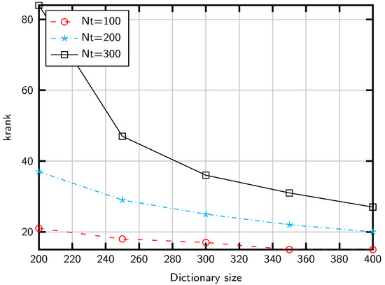 In this section, we provide some insight regarding the choice of the dictionary size G. Let us start by determining a sufficient condition for unique angular identification. To that end, we first define the Kruskal rank of a matrix , . If , then x is the maximum number such that any x columns of are linearly independent.