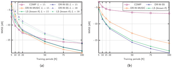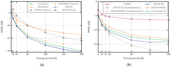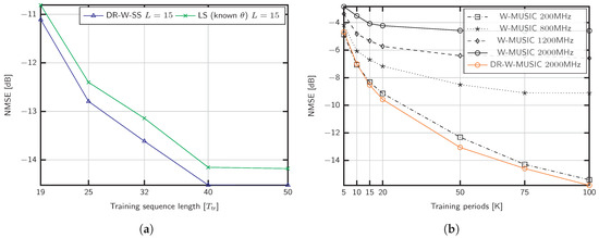 Figure 3a shows the NMSE obtained with the proposed algorithms. The training sequence length is set to and the channel parameters are adjusted according to massive MIMO settings with GHz, MHz, channel propagation paths, and a SNR of 15 dB. Using the same training sequence, we compare our methods with COMP in [34], which supports wideband estimation in the absence of beam squint. For , the proposed methods achieve better performance than COMP when the number of training blocks K is large, but the accuracy of the estimation deteriorates when . This behavior is motivated by the lack of similarity between the sample covariance matrix and the actual channel covariance matrix that makes difficult the discrimination of the signal and noise subspaces (see Algorithm 1). Nevertheless, values of K above 50 are feasible in practical settings, since K is not restricted by the channel coherence time. We also include the case of channel paths in Figure 3a. Under such as sumption, COMP and DR-W-MUSIC do not applydue to the lack of angular sparsity, and the limited rank of the sample covariance matrices, respectively. Conversely, the DR-W-SS approach performs close to the benchmark with known angles, denoted by LS (known ).