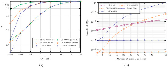 Regarding the actual channel estimation, in scenarios suitable for DR-W-MUSIC with , DG channel estimation is more efficient. This applies to mmWave frequencies and other massive MIMO scenarios, e.g., [8,37,50,51,52,53]. Conversely, LMMSE estimator might be less complex for large number of channel propagation paths, i.e., .