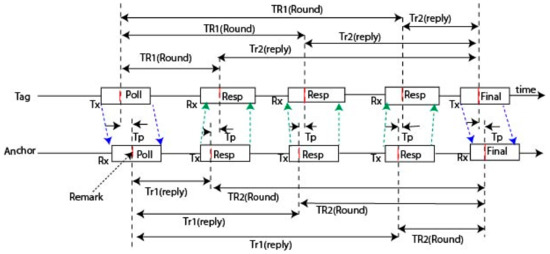 The final message communicates the tag’s times to the anchors and is the values of TOF which is the propagation time of the message between tag and anchors. Here, anchor calculates the range of the tag which is given in Equation (1):