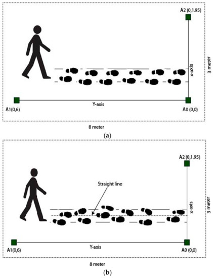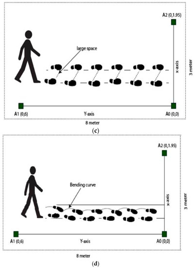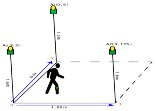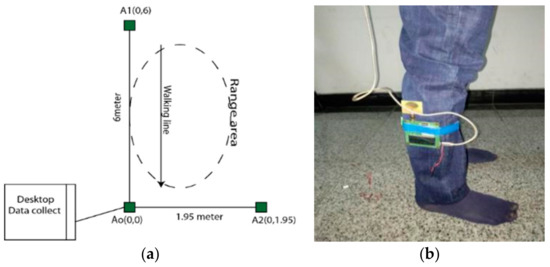 The length and width of the corridor was 8 m and 3 m respectively. The height of the anchor’s position from the floor was 1.6 m and the measurement of and from the center in an anchor to were (0, 1.95) m and to (0, 6) m, respectively. For the mounting of an anchor position, we used hanging stands which can be seen in Figure 2 and the tag can be freely moved to various predefined positions that were fixed on subject’s body in the lower limb portion.