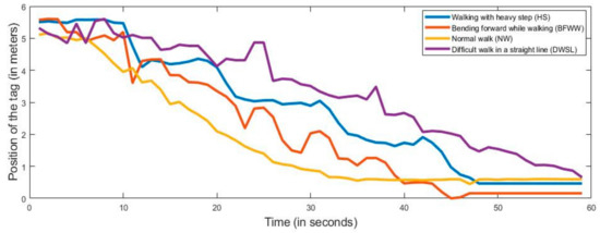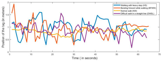 On the basis of our proposed method, we monitored the detection of walking abnormality. Our experimental task divided four parts on the basis of symptoms such as NW, DWSL, BFWW, and HS. When the subjects performed the walking test, the anchors and tags continuously distributed their signals. For the experiments, nine persons participated, and their ages ranged from 26 to 35 years. They performed 10 times for each symptom and by using the UWB RTL system, we collect the data. We captured the data for more than 60 s, but for classifying we took 60 s in each datum. Therefore, we collected the data in total 360 (symptoms of four types, 10 performances, and nine subjects). After all these experiments, we also capture the activities data into the log file from PC where the software (RTLS-PC) consists of a log file. Every location was estimated by the value of X, Y and Z in the log file. We only took the and values because our experimental sensor device is a two-dimensional tracking device and Z is the height of the anchor position from the floor which is the same for all anchors. In Figure 5, we present the horizontal movements of the subject where the -axis is the position of the tag and the -axis presents the time. In Figure 6, we present the vertical movements of the subject, where the -axis presents the position of the tag and the -axis presents the time. We use our sensor (tag) on the patient’s lower limb portion of the leg and all of the data we take is the position of the tag in every activity.