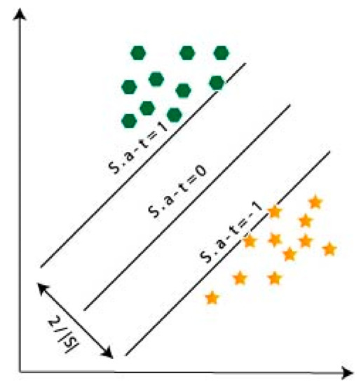 Both hyperplanes can select for the linearly separable training data, therefore, there are no marks to expand their distance and the distance between hyperplanes is . Experimental data are called support vectors (SVs) which are included with the hyperplanes. The separable hyperplane with the highest margin can be defined by . This margin is used to provide SVs means of training data which is denoted by,