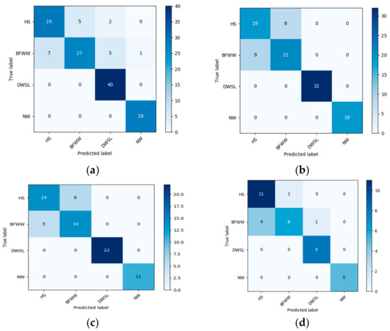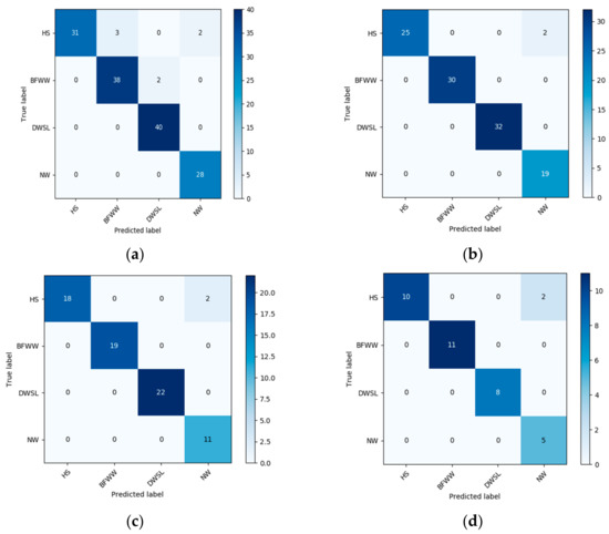 The result of the confusion matrix of four activity using SVM-radial basis function (RBF) kernel function (a) 60% training and 40% testing; (b) 70% training and 30% testing; (c) 80% training and 20% testing and (d) 90% testing and 10% training.