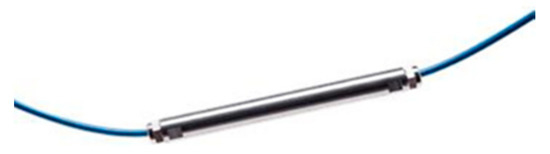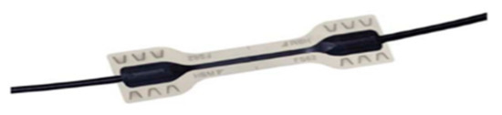 The sensor chain was custom manufactured for each beam. Each chain has a temperature sensor (Figure 2) to compensate the temperature effect on the deformation sensors. The sensor chains have two terminals to which the interrogator may be connected. That redundancy effect is important as if a part of the chain were to be damaged, the terminal could always be measured in the undamaged area of the array.