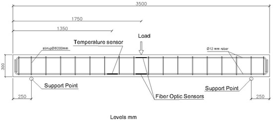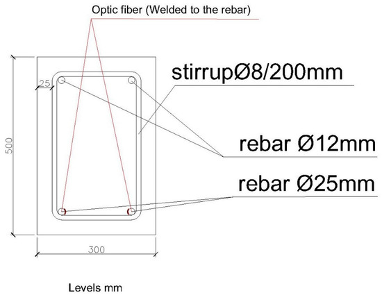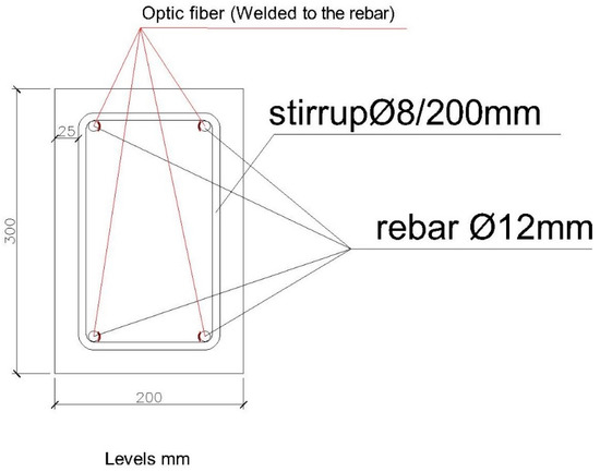 The first structural element we are going to test is a reinforced concrete beam with a section of 200 × 300 mm. Its reinforcement is of four rebars with a diameter of 12 mm, with stirrups with a diameter of 8 mm every 200 mm. The steel quality is B500S. The beam length between resting points is 3000 mm. The reinforcement scheme and placement of the fiber optic sensors is illustrated in Figure 3 and Figure 4.