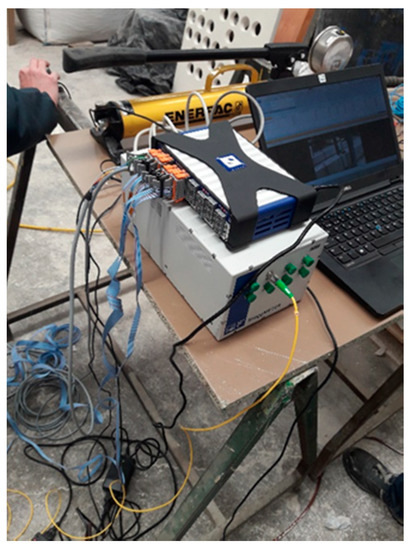 The interrogator is connected to the computer, which uses specific Catman Easy software, providing us the data on the deformations suffered by the beams in real time. The data acquisition system installed is shown in Figure 8.