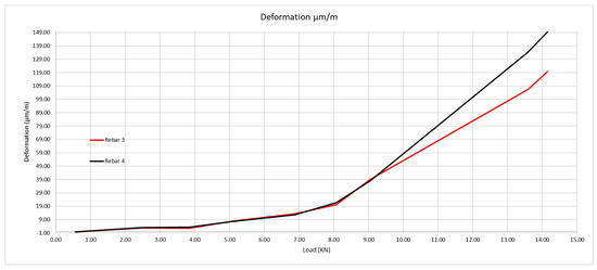 Relation between loads applied and deformation of the rebars 3 and 4.