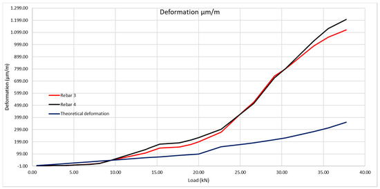 As happened with the 200 × 300 mm beam, the theoretical deformation of the beam reinforcement is far from appearing like its real behavior. In this case, the crack has opened up at a point very near to the optic fiber, so the concrete shall not collaborate when its traction tension is reached.
