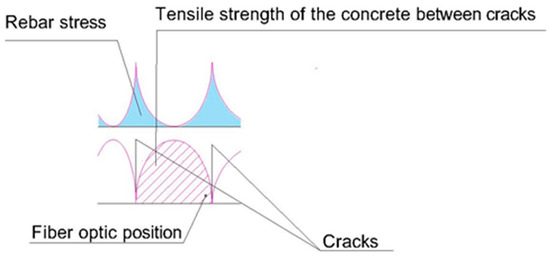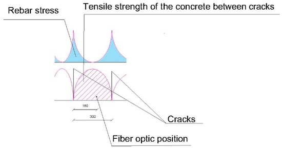For a load of 54 kN, the moment corresponds to 40.5 mkN, and applying Equation (1) we obtain a resistance to traction of the concrete of 3.24 MPa, compared with the 8.9 MPa obtained in the laboratory. In this case, the crack has opened at a point very near to the optic fiber, so the concrete can barely contribute to avoid deformation of the steel (Figure 24).