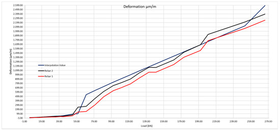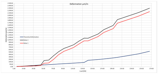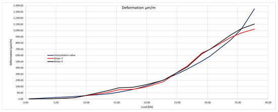 The same method shall be applied as for the 200 × 300 mm beam, considering the steel deformation for resistance to traction of the concrete obtained by the laboratory tests, and subsequently that obtained with the optic fiber (Table 9 and Figure 23).