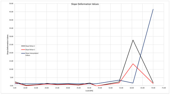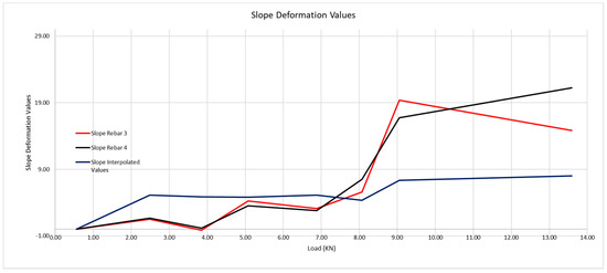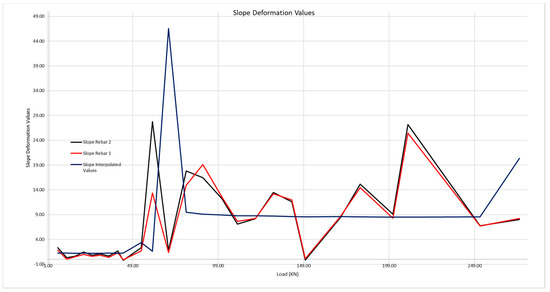 Slope theoretical deformation curves of the rebars (interpolated values) and of rebars 1 and 2.
