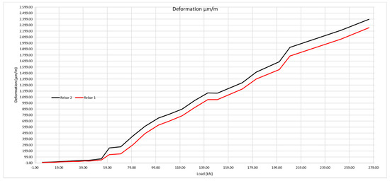 Relation between loads applied and deformation of the rebars 1 and 2.