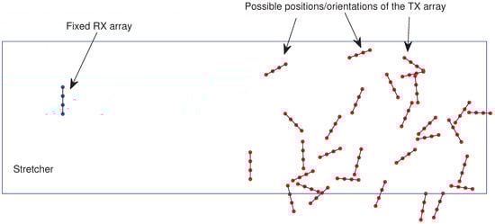 We consider that the stretcher position is m and that the stretcher dimensions are m and m. We also assume that the position and orientation of the array of receive antennas of the AP are fixed. However, it should be noted that both the position and orientation of the array of transmitter antennas can vary within the stretcher, as they will depend on the medical operation itself and change over time.
