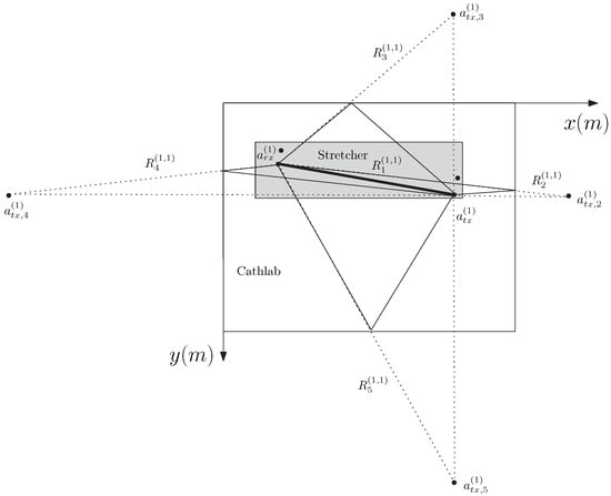 Figure 4 shows an example of the application of the images method applied to the CathLab environment, considering a MIMO system with and (for demonstration purposes, only the images associated to one pair of antennas are shown).