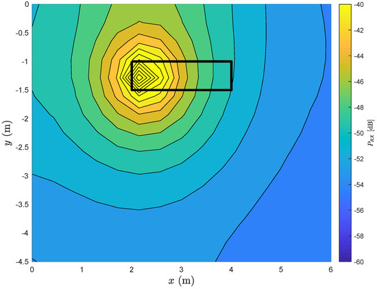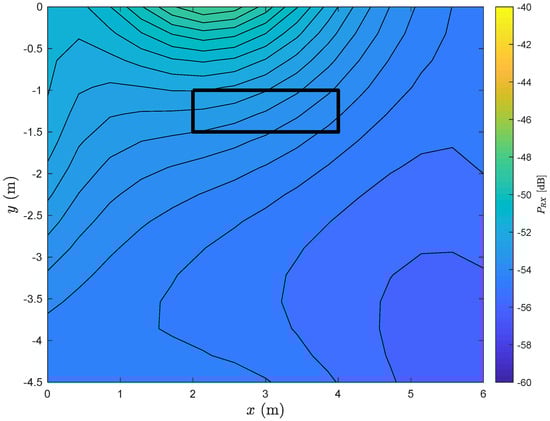 Contour of received power along the room considering a SISO system without the line-of-sight (LoS) component.
