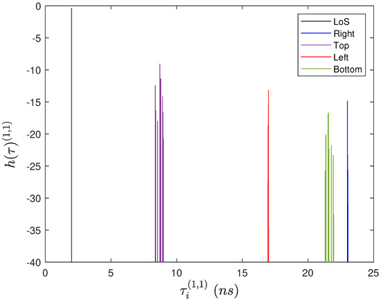 where represents the reflection coefficient of the ith reflexive surface, which depends not only on the the material that composes the surface, but also on the carrier frequency []. Unless it is otherwise stated, we consider that for the I active multipath components.