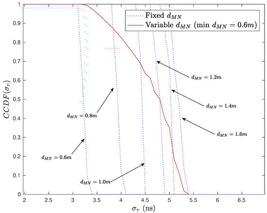 Figure 8 shows the complementary cumulative distribution function (CCDF) of the RMS delay spread considering different distances between the transmitter and receiver.