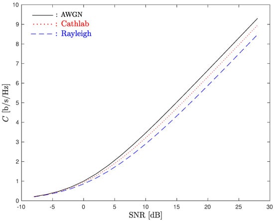 Let us now see what is the impact of considering the CathLab-based channels introduced in the Section 3.2. Figure 12 shows the ergodic capacity of an MIMO-OFDM system considering both Rayleigh as well as different CathLab channels.