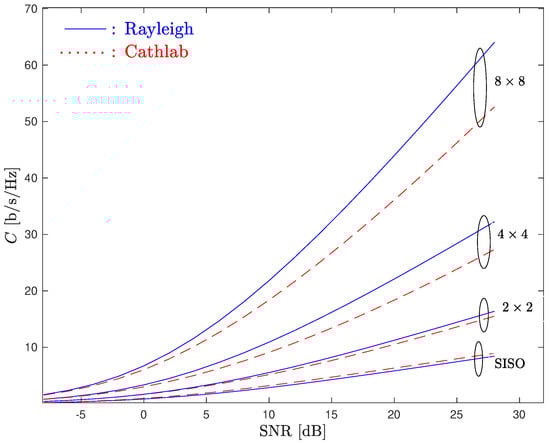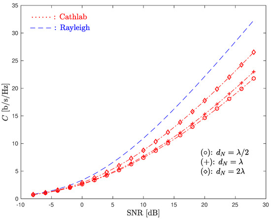 From the figure, note that by increasing the spacing between the RX antennas, the capacity of the CathLab system increases and becomes closer to that the one obtained in uncorrelated Rayleigh channels. However, also note that at GHz, we have cm, which means that increasing above it (i.e., ) might be not feasible, especially for MIMO systems with more than two receive antennas, as the RX array would become too large.