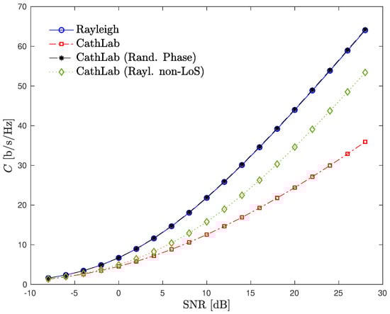 From the figure, note that when the CathLab channel is combined with a fading component on the non-LoS rays, the system capacity increases substantially relatively to the case where the pure CathLab channel is considered. Moreover, with a CathLab channel where a random phase factor is introduced on each ray, the capacity becomes equal to the one obtained in the ideal Rayleigh fading channel. This can be explained by the fact that both these variations of the CathLab channel leads to uncorrelated elements in the channel matrix, making it well-conditioned with a high probability and, consequently, improving the channel capacity.